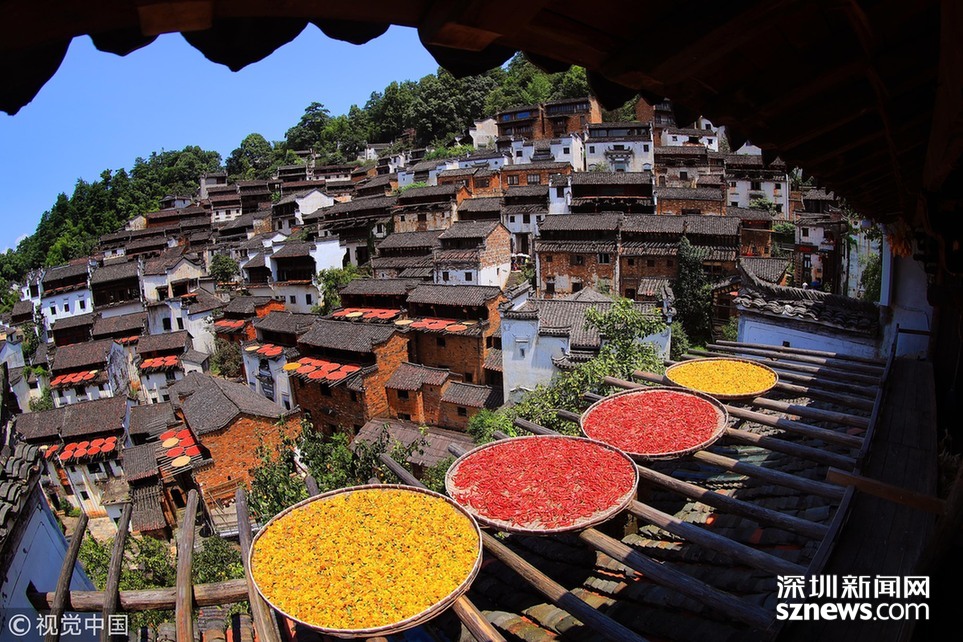 2018年8月7日,江西婺源縣篁嶺古村落,壯觀“曬秋”場景。當(dāng)日立秋節(jié)氣,江西婺源縣篁嶺古村的農(nóng)作物普遍豐收,村民們又迎來了一年一度的“曬秋”季。村民們將收獲來的紅辣椒、玉米、南瓜、稻谷和菊花等色彩斑斕的農(nóng)作物,晾曬在依山而建的徽派民居房前屋后的木制曬架上,在秋日陽光的照射下,色彩繽紛圓圓的曬扁,鋪就在錯落有致的徽派民居之間,格外璀璨奪目,蔚為壯觀。目前,“篁嶺曬秋”已經(jīng)成為中國鄉(xiāng)村旅游的一張名片。