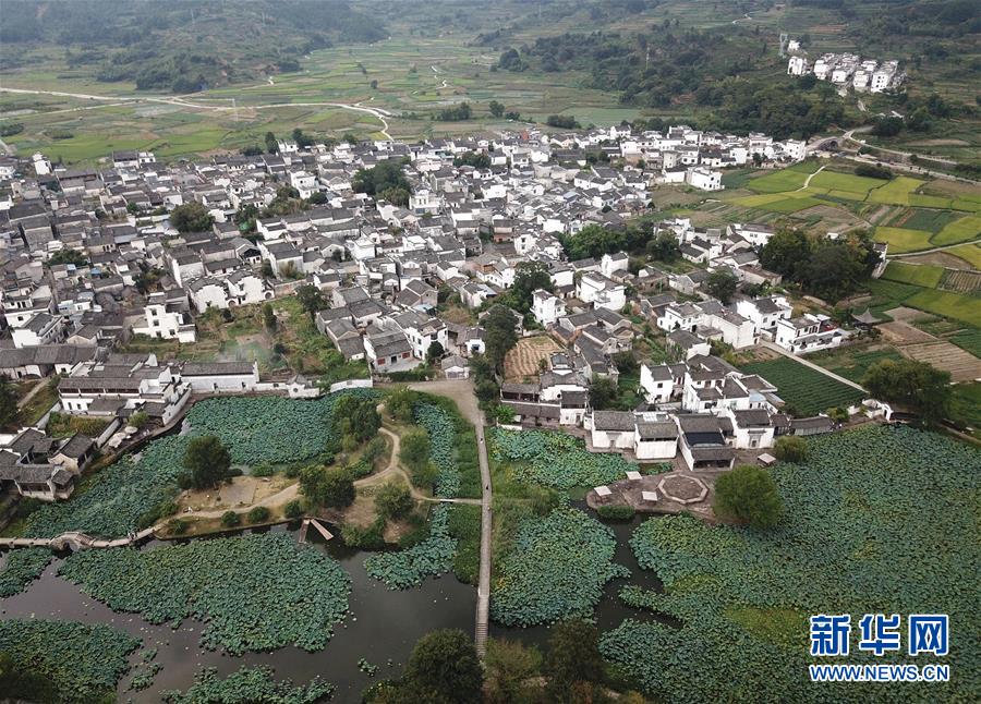 這是無人機(jī)拍攝的呈坎村內(nèi)的荷塘(8月28日攝)。新華社記者劉軍喜攝
