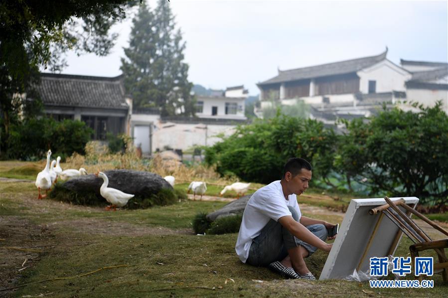 游客在呈坎村內(nèi)寫生(8月28日攝)。新華社記者劉軍喜攝
