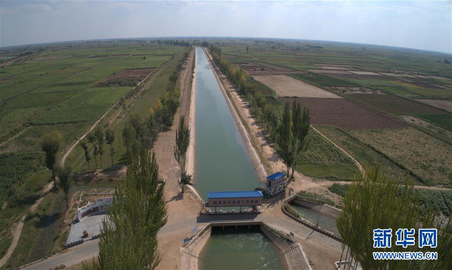 9月4日無人機拍攝的河套灌區(qū)楊家河干渠第二節(jié)制閘。 新華社記者 劉詩平 攝