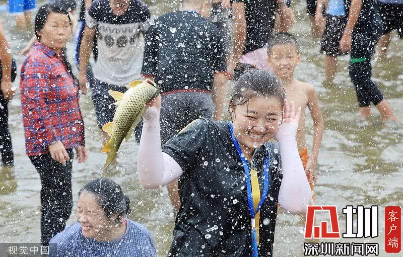 苗族群眾在活動場地內(nèi)爭搶活魚,搶的魚越多,寓意福氣就越多。