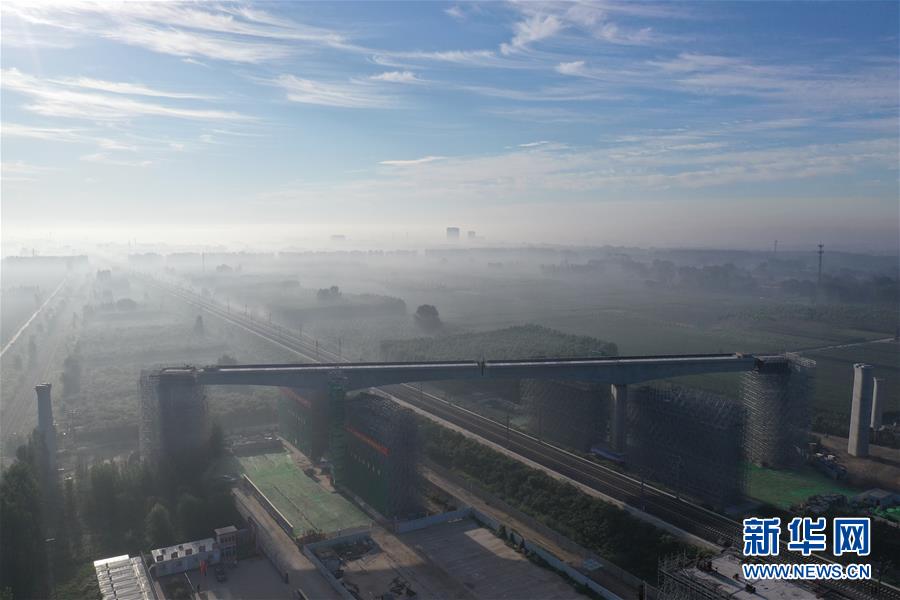 這是8月27日晨無(wú)人機(jī)拍攝的轉(zhuǎn)體完成的橋梁。新華社記者邢廣利攝