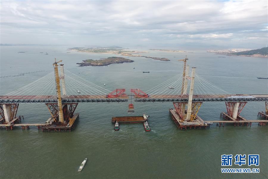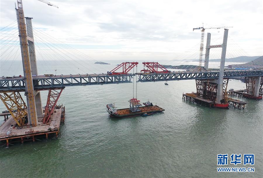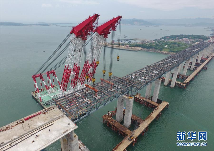 9月21日,平潭海峽公鐵大橋鼓嶼門航道橋的鋼桁梁在吊裝中(無人機(jī)拍攝)。9月25日上午,隨著一段長17米、重473噸的鋼桁梁被精確固定到位,總長16.34公里的平潭海峽公鐵大橋合龍貫通。平潭海峽公鐵大橋是福州至平潭鐵路控制性工程,也是“十三五”規(guī)劃中北京至臺灣高鐵的先期工程。大橋起于福州市長樂區(qū),“踏”過四座小島后抵達(dá)中國第五大島平潭,上層設(shè)計(jì)為時(shí)速100公里的六車道高速公路,下層為設(shè)計(jì)時(shí)速200公里的高鐵。據(jù)福建福平鐵路公司介紹,大橋計(jì)劃2020年正式通車。在六年建設(shè)過程中,平潭海峽公鐵大橋所應(yīng)用研發(fā)的多項(xiàng)技術(shù)、裝備創(chuàng)下國內(nèi)外紀(jì)錄。新華社記者林善傳攝
