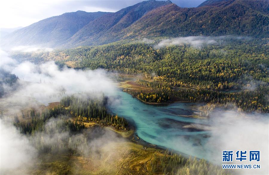 9月24日無人機拍攝的喀納斯景區(qū)風光。 新華社記者 王菲 攝
