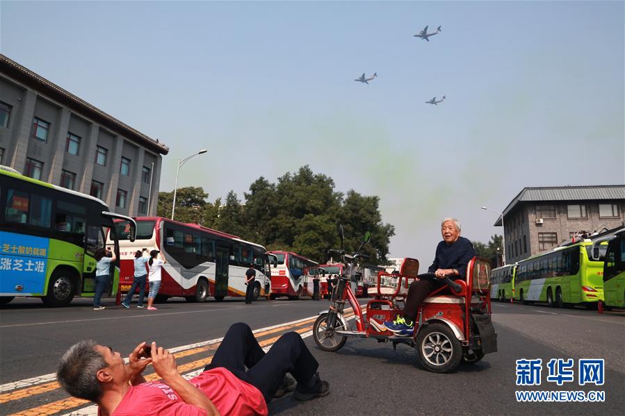 10月1日,在北京琉璃廠,當受閱飛機飛過時,北京市民趙先生(左)為92歲的老母親拍照留影。當日是國慶節(jié),全國各地的人們用各種方式歡度節(jié)日。新華社記者 薛東梅 攝
