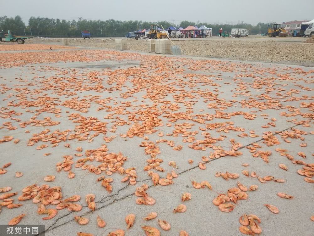 渤海灣畔海產(chǎn)豐收,成群魚蝦分揀后當(dāng)街晾曬,場面賽曬糧食