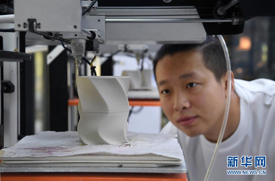 在江西景德鎮(zhèn)陶溪川文創(chuàng)街區(qū)的陶瓷3D打印體驗中心,一位工作人員在用3D打印技術制作陶瓷花瓶(7月26日攝)。新華社記者 萬象 攝