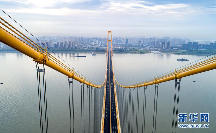 楊泗港大橋建設(shè)創(chuàng)造了多項世界之最:一是主橋跨度達1700米,為世界上跨度最大的雙層懸索橋;二是主橋設(shè)置雙層雙向12車道,是世界上通行能力最大的公路橋梁;三是大橋主纜設(shè)計張力6.5萬噸,采用了世界上強度等級最高的主纜鋼絲;四是大橋設(shè)置機動車道、非機動車道、人行觀光道,集過江交通與觀光于一體,是長江上功能最完備的橋梁。新華社記者熊琦攝