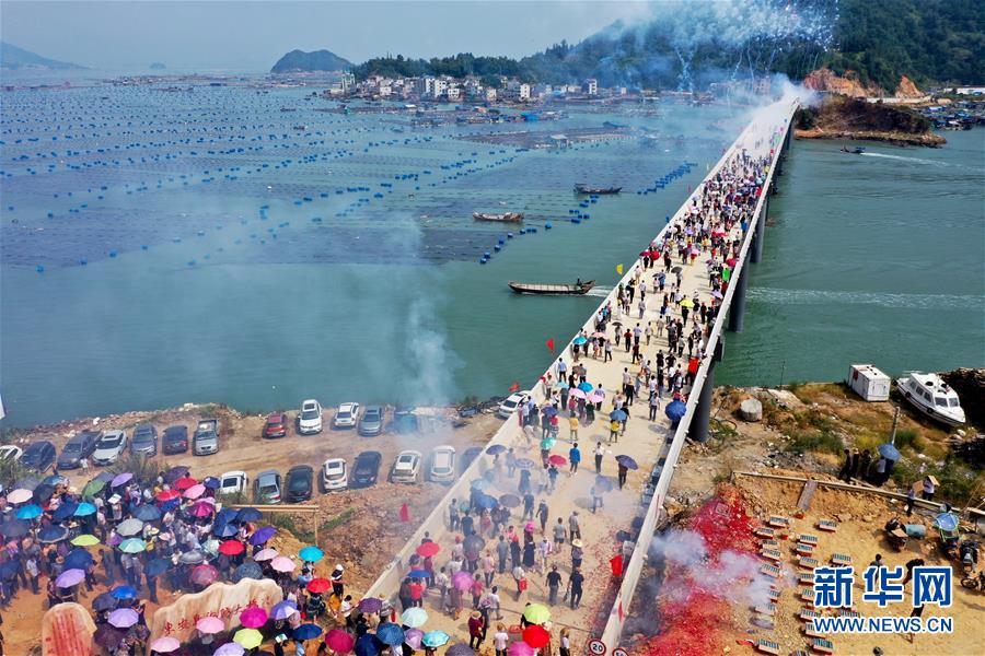 10月12日,福建省霞浦縣東安島海防大橋正式通車,這是當?shù)厝罕娮咴谛聵蛏希o人機拍攝)。新華社記者姜克紅攝