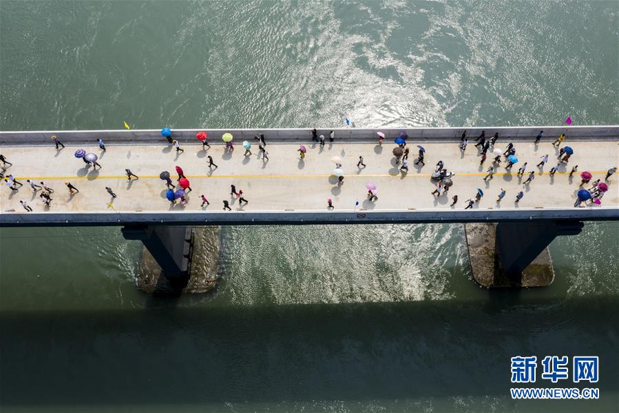10月12日,福建省霞浦縣東安島海防大橋正式通車,這是當(dāng)?shù)厝罕娮咴谛聵蛏希o人機拍攝)。新華社記者姜克紅攝