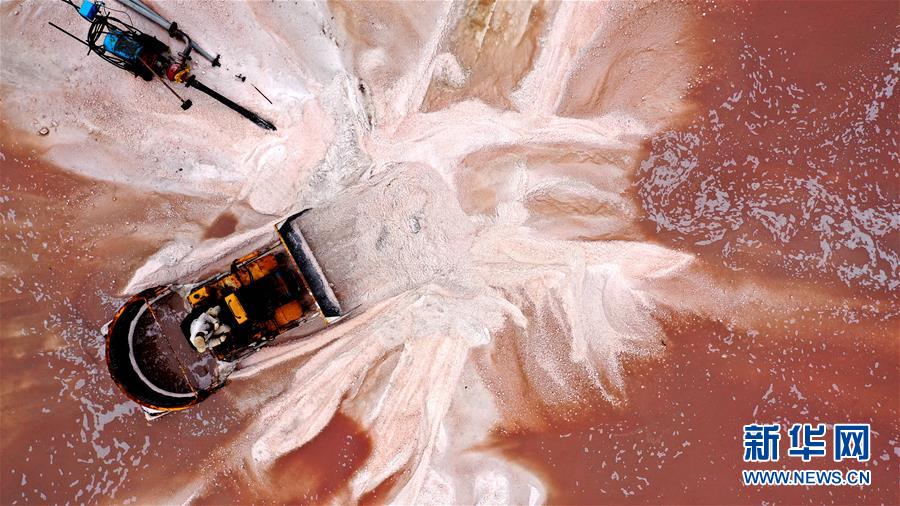 魯北鹽場(chǎng)工人在鹽池中收獲海鹽(10月9日無(wú)人機(jī)拍攝)。新華社記者 朱崢 攝
