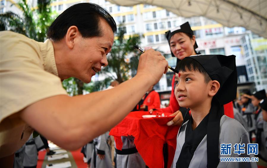 10月13日,參加儀式的嘉賓為小朋友“點朱砂”。當日,??诤嬌賰核囆g中心為500名小朋友舉行“開筆禮”,通過“點朱砂,啟智慧”“習書法,描人字”等儀式讓孩子們體驗中國傳統(tǒng)文化。新華社記者郭程攝
