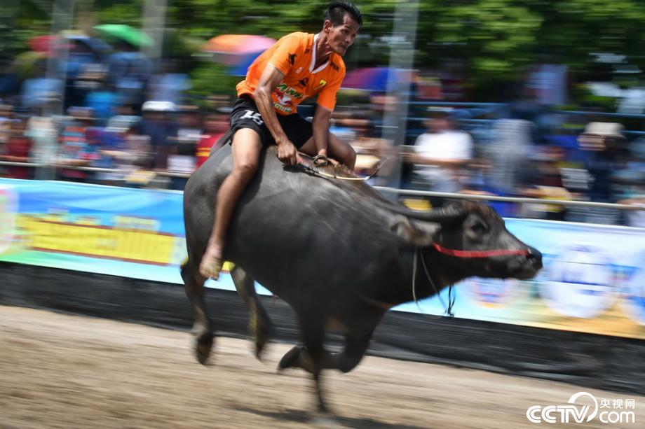當?shù)貢r間2019年10月12日,泰國春武里舉行一年一度的水牛賽跑,選手騎??癖?。視覺中國
