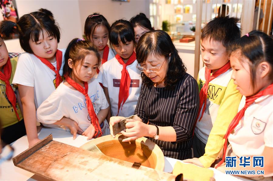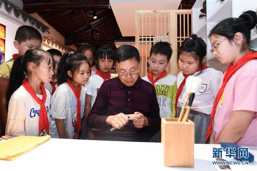 10月14日,小學(xué)生在非遺活態(tài)傳承館使用湖筆練習(xí)書法。