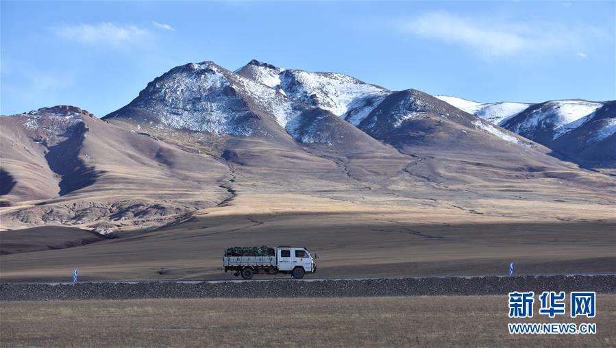 西藏那曲市申扎縣境內(nèi),一輛卡車從山前駛過(10月12日攝)。 深秋時節(jié)的藏北,最低氣溫已降至零攝氏度以下,呈現(xiàn)出蒼涼和壯美交織的獨特景觀。 新華社記者 周錦帥 攝