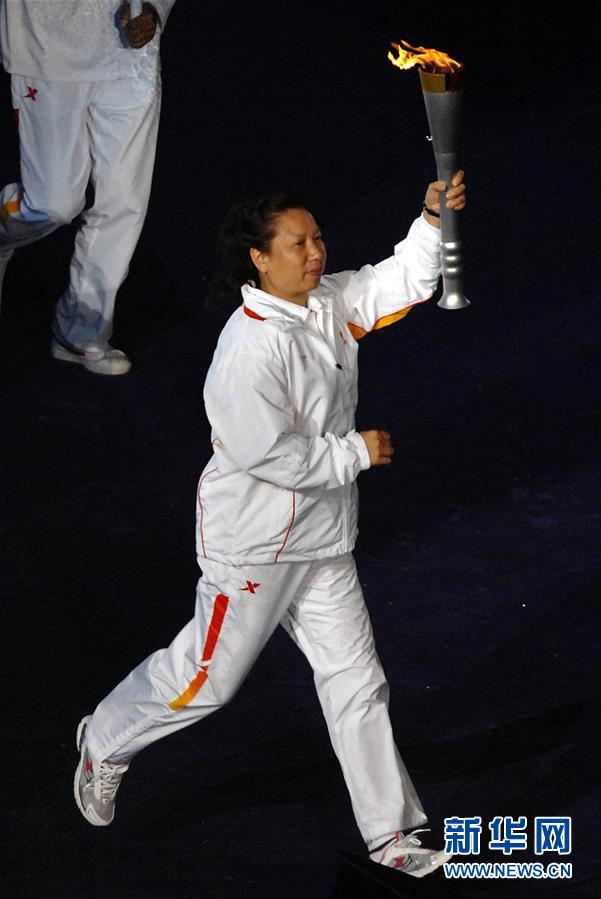 圖為韓愛萍在武漢舉行的第六屆全國城市運(yùn)動會開幕式上傳遞火炬(2007年10月25日攝)。新華社記者王頌攝