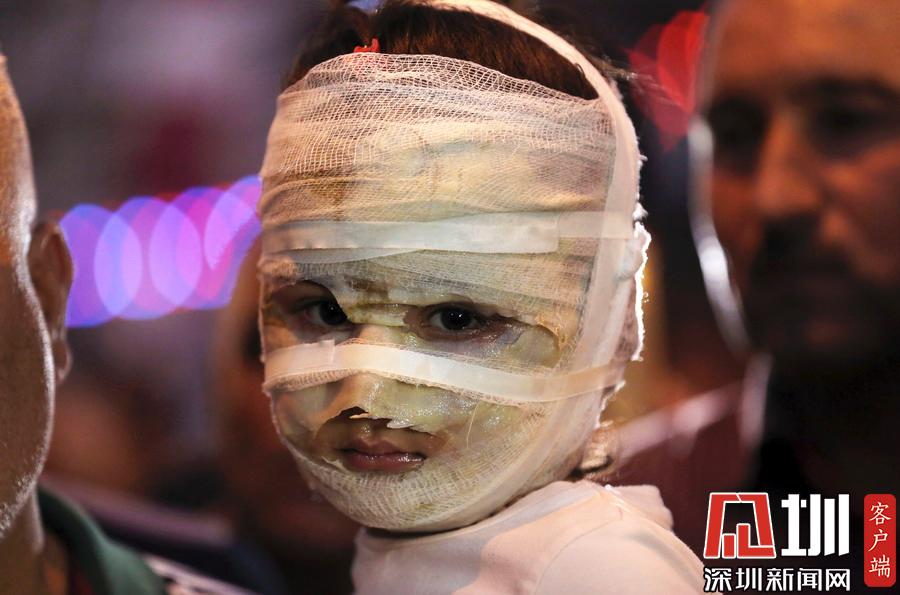 當(dāng)?shù)貢r間2016年7月9日,伊拉克卡拉達(dá),4歲的Asal Ahmed在爆炸現(xiàn)場被爸爸抱著。開齋節(jié)期間,Asal和媽媽一起逛街,結(jié)果碰上一起自殺性炸彈襲擊,兩人都嚴(yán)重?zé)齻?/p>