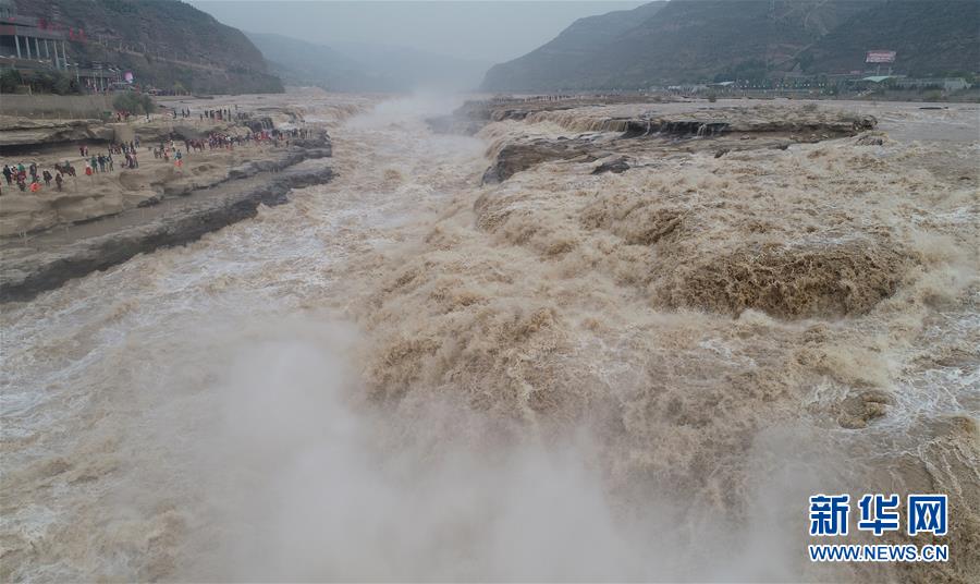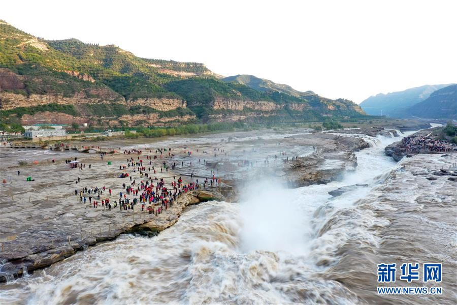 受近日降雨影響,位于山西吉縣的壺口瀑布水量增大,壯美的瀑布群景觀吸引眾多游客前來觀賞。新華社記者楊晨光攝