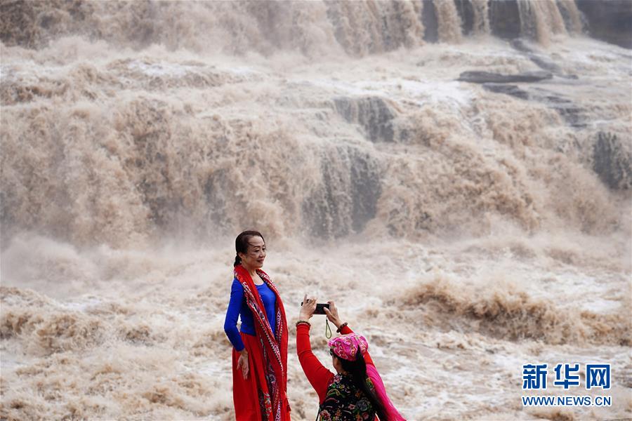 10月17日,游客在位于陜西宜川縣的黃河壺口瀑布岸邊合影。新華社記者邵瑞攝