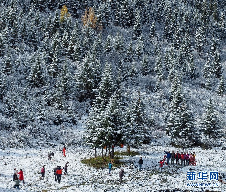 10月17日,在川藏線高爾寺山至理塘路段,部分游客在一個(gè)路邊觀景臺附近拍照留念。當(dāng)日,一場夜雪后,川藏線高爾寺山至理塘路段披上了一層銀裝。雪山、牦牛、云朵、松林,帶來了濃濃的雪域風(fēng)情。  新華社記者 王迪 攝