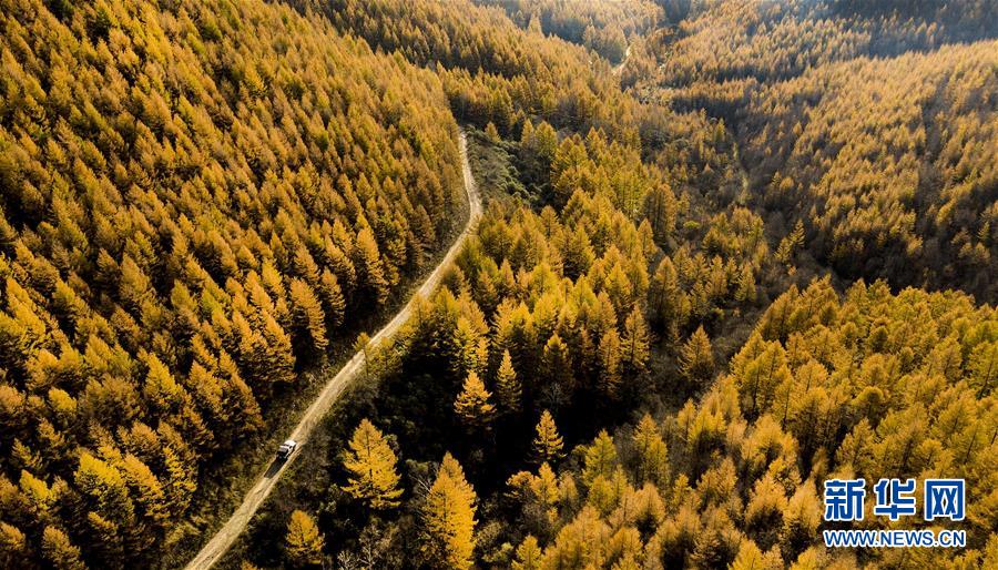 10月8日,一輛汽車行駛在好地方林場(chǎng)的林間道路上(無人機(jī)拍攝)。新華社記者陶明攝