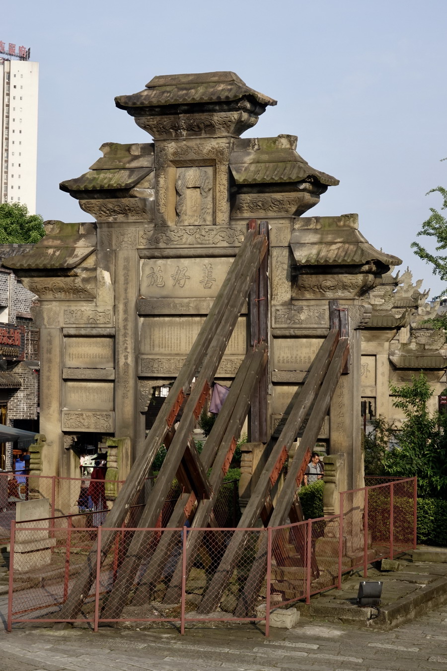石牌坊在我國城鄉(xiāng)交通要道和集鎮(zhèn)上曾經(jīng)大量存在,但大多作為“封建糟粕”被拆毀。比如重慶主城區(qū)大坪的“七牌坊”就毀于文革時期。李仁奇攝