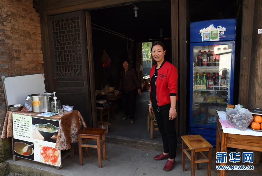 10月24日,班竹村村民王彩妃(前)站在自家的特色小吃攤前。王彩妃曾在縣城打工,村里旅游業(yè)發(fā)展起來后回家開了個小吃攤,收入比以前大大增加。新華社記者韓傳號攝