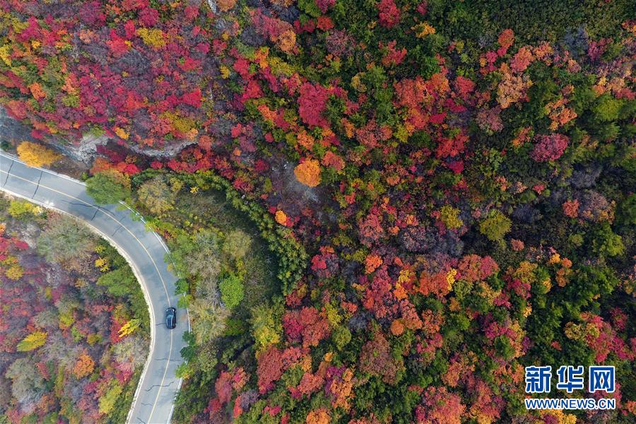 車輛行駛在山西省太原市玉泉山盤山公路上(10月22日無人機(jī)拍攝)。