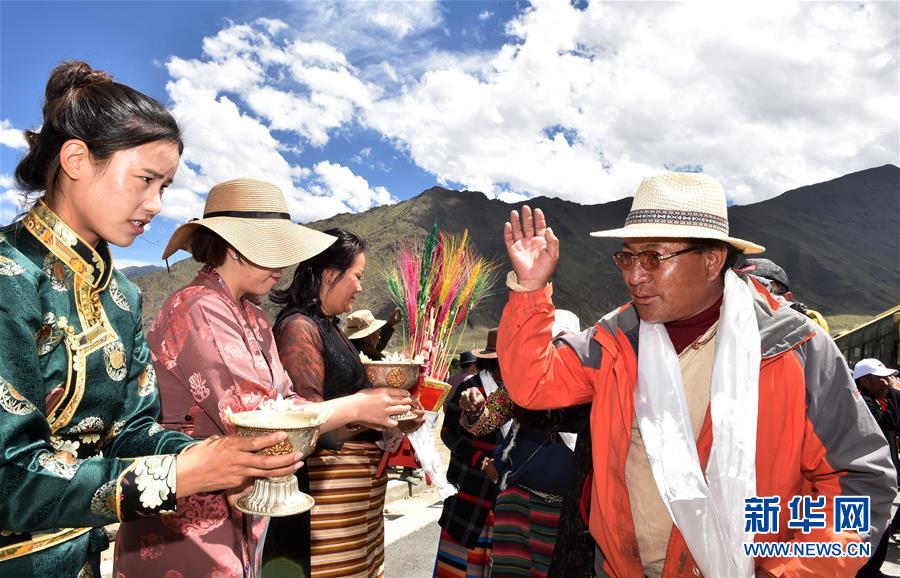 向來自遠方的新鄰居敬獻青稞酒(2018年6月18日攝)。經(jīng)過兩天的馳騁,11輛大巴和31輛大貨車緩緩駛?cè)肜_市堆龍德慶區(qū)古榮鄉(xiāng)嘎沖村,標志著西藏首個高海拔生態(tài)搬遷項目正式實施。新華社記者覺果攝
