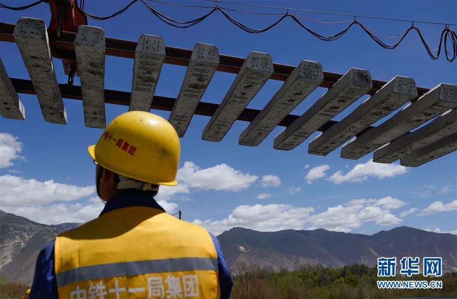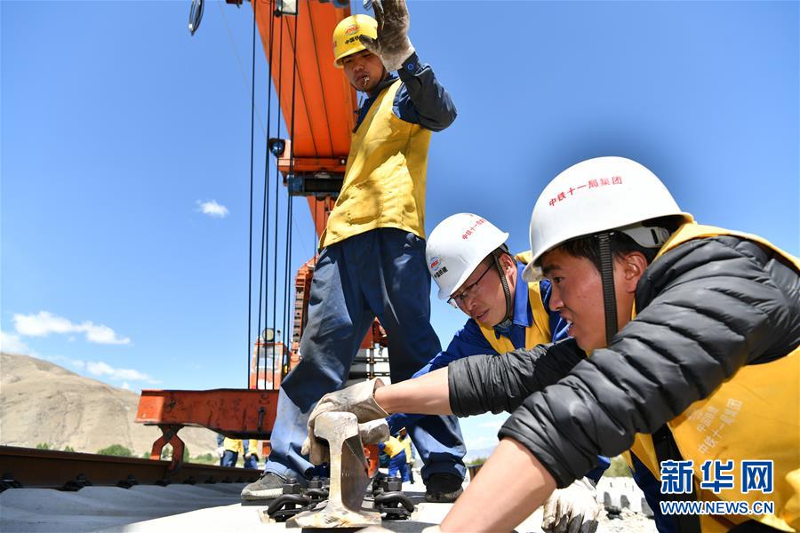 6月6日,負(fù)責(zé)鋪軌的中鐵十一局集團的建設(shè)者在現(xiàn)場作業(yè)。新華社記者普布扎西攝