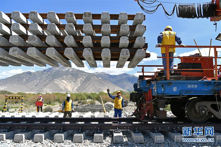 6月6日,負(fù)責(zé)鋪軌的中鐵十一局集團(tuán)的建設(shè)者在現(xiàn)場作業(yè)。新華社記者李鑫攝