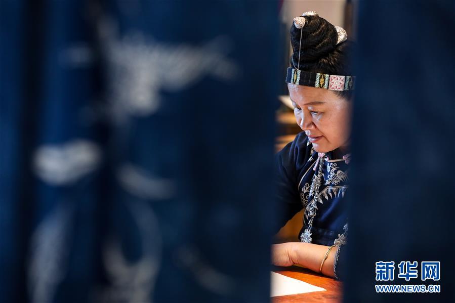 10月29日,楊芳在位于丹寨萬(wàn)達(dá)小鎮(zhèn)內(nèi)的工作室內(nèi)繪制蠟染圖案。新華社記者 歐東衢 攝