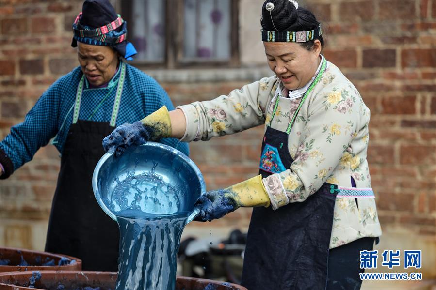 10月28日,楊芳(右)在家中制作靛藍染料。新華社記者 歐東衢 攝