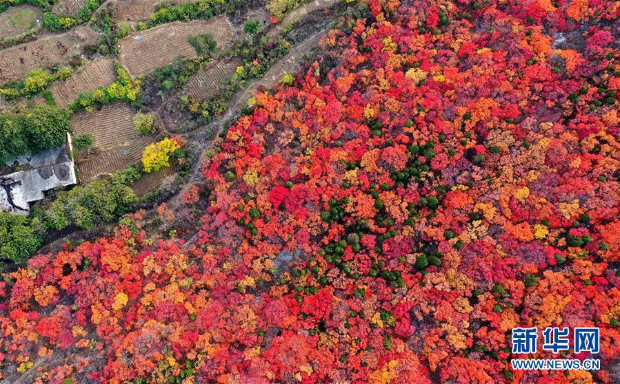 濟南蝎子山上火紅的黃櫨樹林(11月4日無人機拍攝)。  新華社記者 朱崢 攝