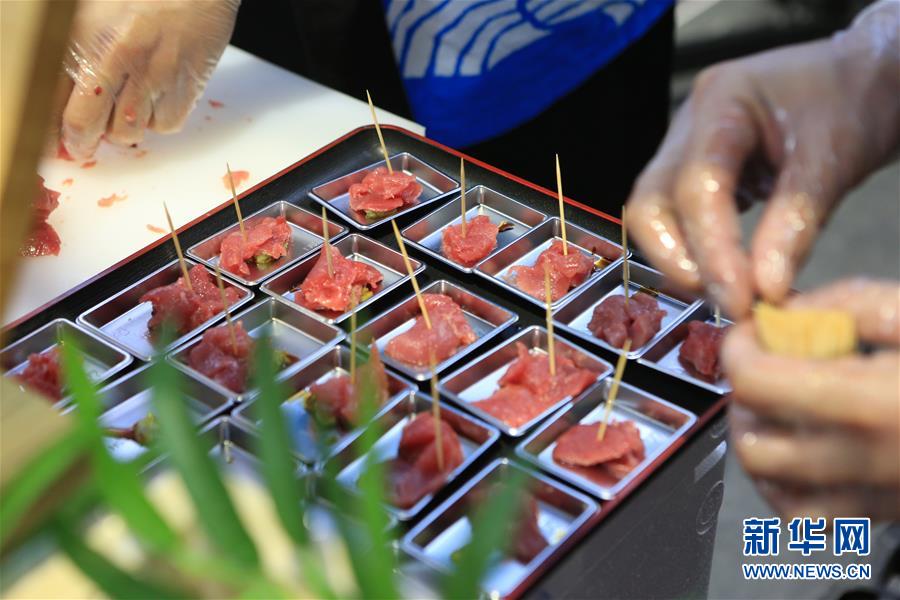 11月7日,切魚師傅為參觀者準(zhǔn)備用于品嘗的藍(lán)鰭金槍魚魚肉。第二屆中國國際進(jìn)口博覽會正在上海國家會展中心舉行。博覽會的食品及農(nóng)產(chǎn)品展區(qū)里匯集了來自世界各地的美食,同時也上演各種精彩美食秀。11月7日,來自日本長崎魚市株式會社的專業(yè)切魚師傅現(xiàn)場解體一條70公斤的藍(lán)鰭金槍魚,吸引大量參觀者觀看、品嘗。新華社記者隋先凱攝