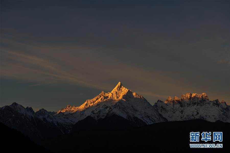 日出時分,陽光照射在梅里雪山緬茨姆峰上(11月8日攝)。 初冬時節(jié),位于云南省西北部的迪慶藏族自治州境內(nèi)的梅里雪山、普達措、納帕海、白水臺等景色迷人。   新華社記者 胡超 攝