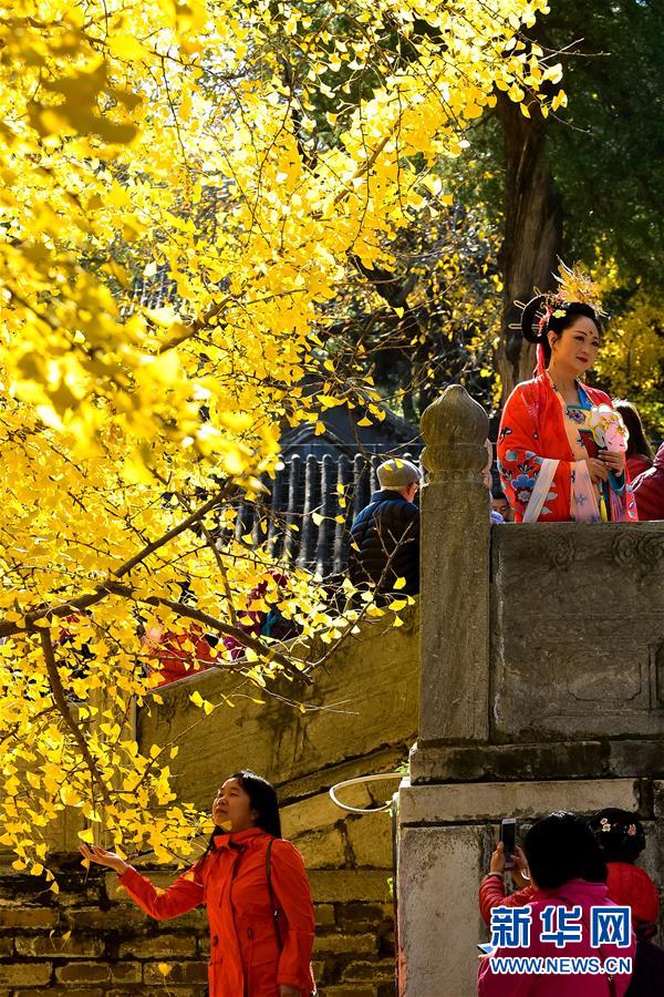 11月11日,人們在大覺寺內的古銀杏樹旁留影。新華社記者尹棟遜攝