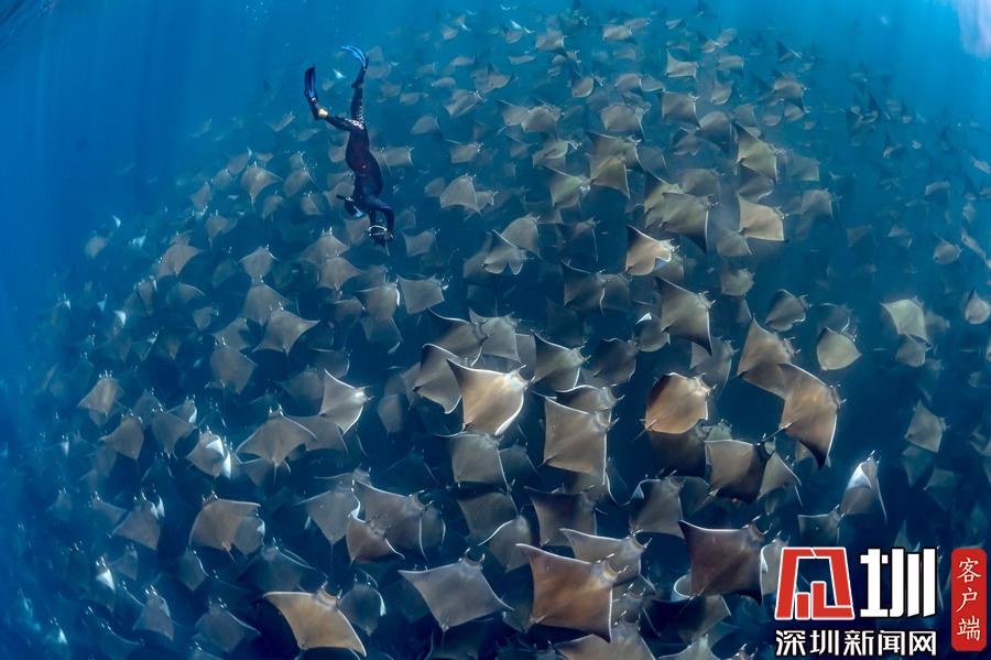 2019年5月31日報道(圖片拍攝于4月23日),環(huán)?;顒蛹壹鏉撍叹欽ay Clue上個月在墨西哥下加利福尼亞州洛斯卡沃斯附近海岸,幸運地邂逅了一支蝠鲼遷徙大軍,數(shù)百只蝠鲼浩浩蕩蕩在海水中行進(jìn),畫面十分震撼。