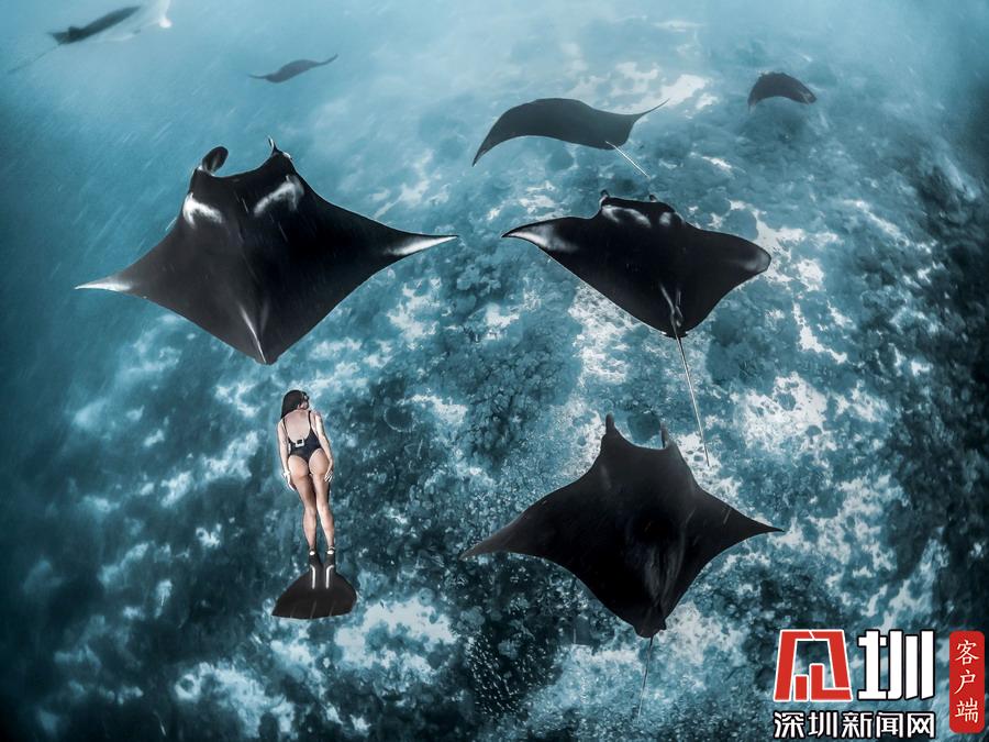 2019年7月2日報道(具體拍攝時間不詳),印度尼西亞科莫多國家公園,美國自由潛水愛好者Kristina Zvaritch一次潛水時,她的正下方恰巧游著幾只巨大的蝠鲼,這令人驚艷的一幕恰巧被她的丈夫拍下來了。當(dāng)她看到這些照片時,自己都被驚呆了。晶瑩剔透的海水使這張照片有了視覺錯位的效果,讓人以為Kristina與這些魚處于相同的高度,但實際上她離這些魚還有10-19英尺左右的距離。