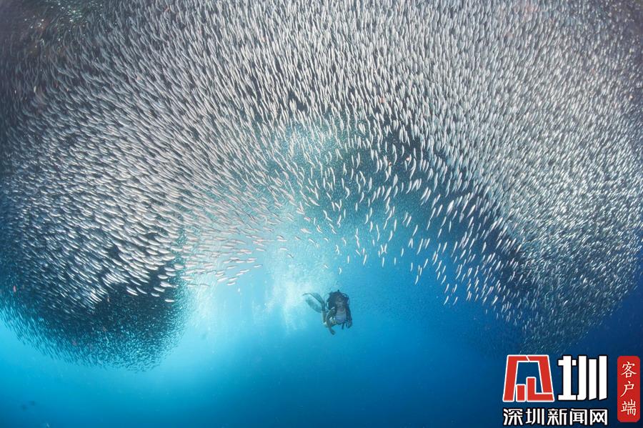 2018年12月24日報道(具體拍攝時間不詳),這張驚艷的照片記錄了沙丁魚大軍為一位幸運的潛水員讓路的瞬間,數(shù)百萬條銀光閃閃的小魚兒簇?fù)韲@在他的一側(cè),恰似熠熠生輝的繁星,如眾星捧月一般畫面十分驚艷。