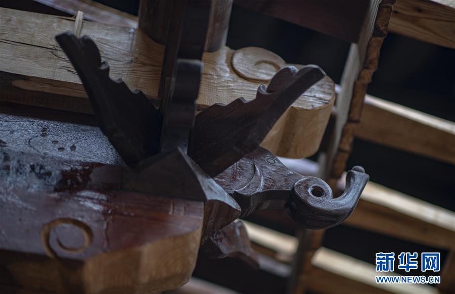 位于石屏縣異龍鎮(zhèn)符家營村一戶老屋中“修舊如舊”的房梁(8月8日攝)。新華社記者江文耀攝