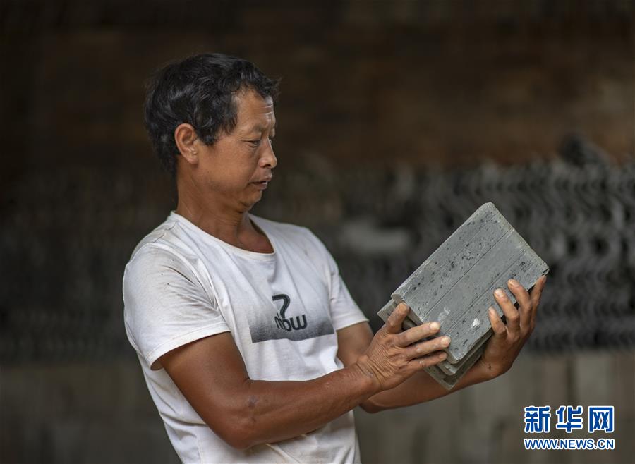 石屏縣異龍鎮(zhèn)符家營村村支書楊松在挑選準備用于修繕老屋的地磚(8月8日攝)。新華社記者江文耀攝