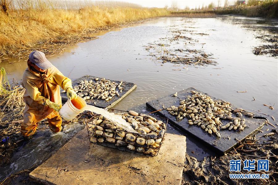 11月18日,工人在采收蓮藕。初冬時節(jié),河北省唐山市曹妃甸蓮藕豐收,工人們在結冰之前忙著采收蓮藕。新華社記者楊世堯攝