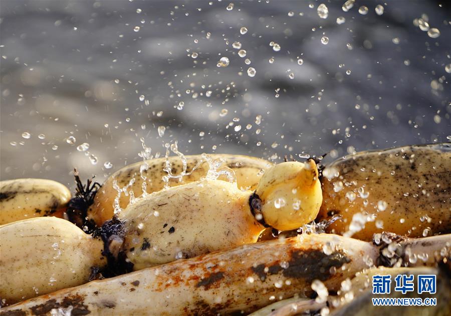 11月18日拍攝的蓮藕。初冬時節(jié),河北省唐山市曹妃甸蓮藕豐收,工人們在結冰之前忙著采收蓮藕。新華社記者邢廣利攝