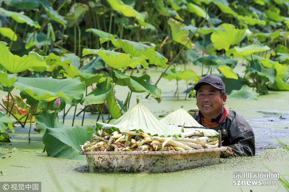 2018年7月25日,江蘇淮安,種植戶在挖藕帶。