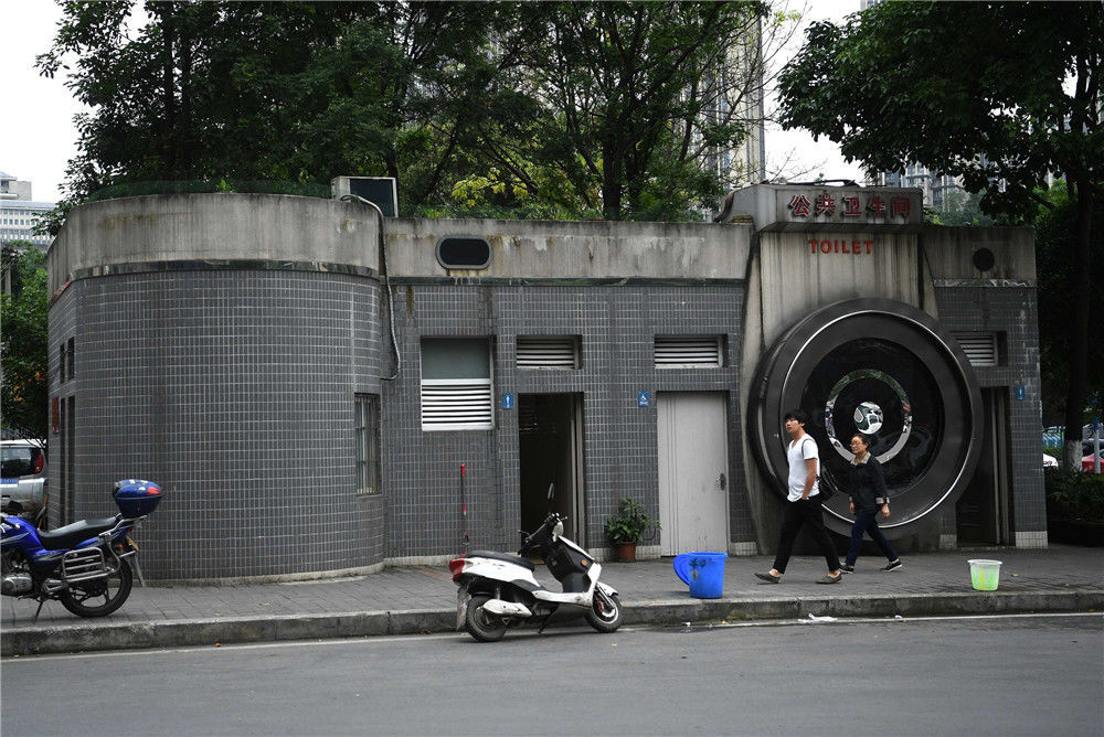 2017年5月5日,重慶,市民經(jīng)過街頭創(chuàng)意“照相機(jī)”廁所都會(huì)駐足觀看。以“照相機(jī)”外形來修建的公共衛(wèi)生間,成為一道創(chuàng)意城市風(fēng)景線。徐勇/視覺中國
