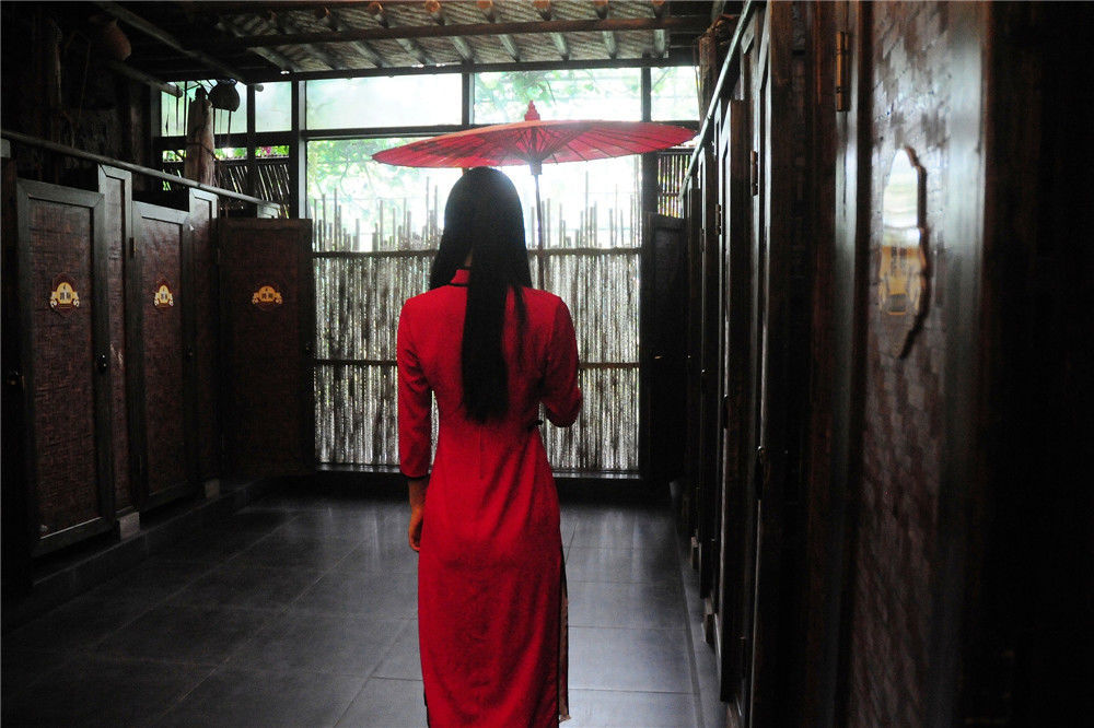 2016年09月29日,杭州,在女廁所,里面也是機(jī)關(guān)重重,讓許多游客不敢進(jìn)去,里面還有人扮演紅衣女鬼,撐著紅傘時(shí)不時(shí)在廁所里面走動(dòng),或者你上廁所的時(shí)候突然給你遞紙巾。益鵬/視覺(jué)中國(guó)