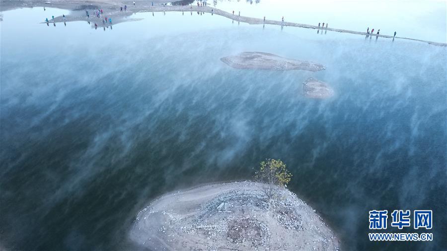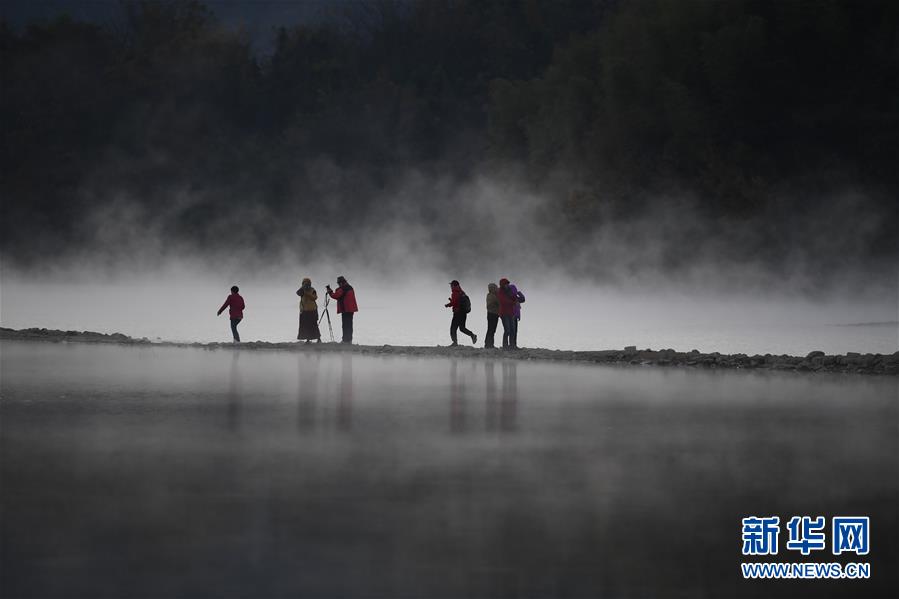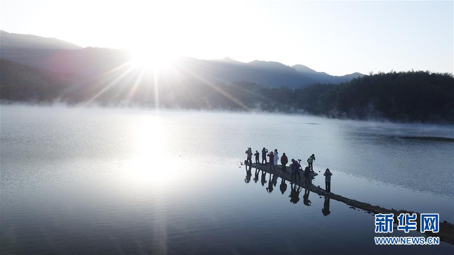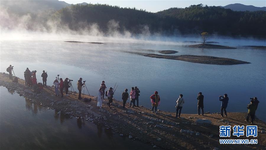 11月14日,游客在奇墅湖邊拍攝風(fēng)光。 初冬時節(jié),安徽省黃山市黟縣奇墅湖晨霧縹緲,別具韻味。新華社記者劉軍喜攝