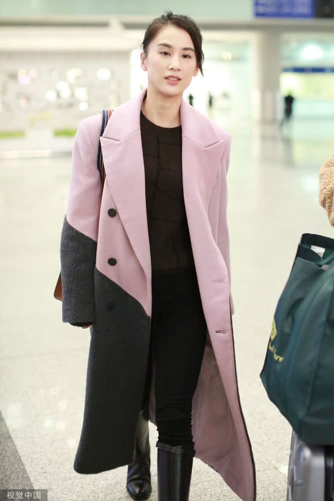 黃圣依穿拼色大衣。