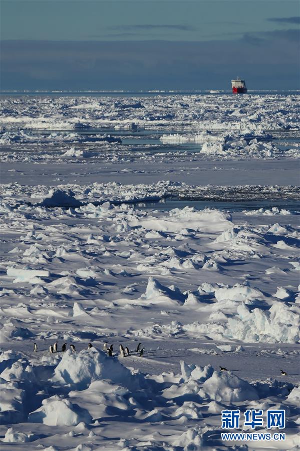 從“雪龍2”號(hào)上拍攝的企鵝群和“雪龍”號(hào)(11月19日攝)。新華社記者劉詩平攝